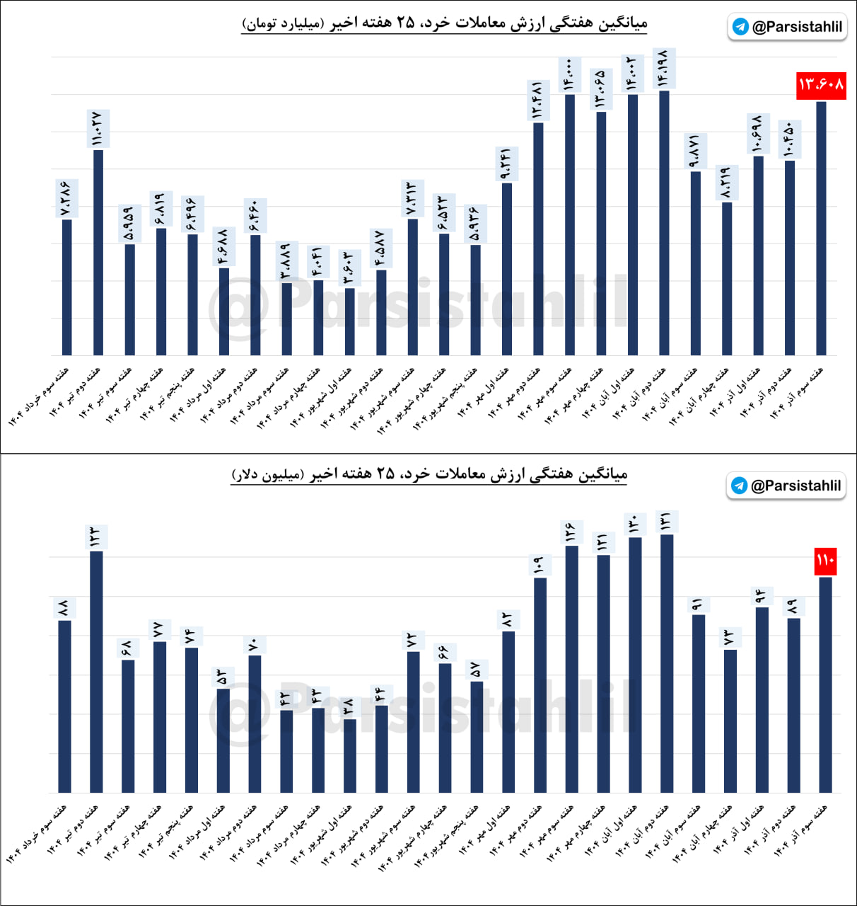 میانگین هفتگی معاملات خرد (ارزش معاملات دلاری) هفته سوم آذر 1404 به 110 میلیون دلار رسید.