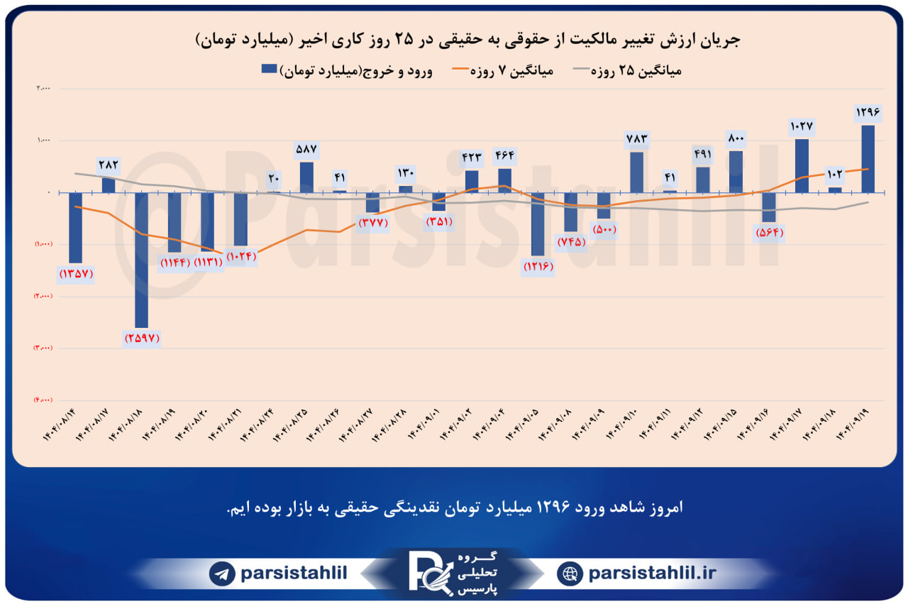 در بازار امروز 1404/09/19 مجموعا مبلغ 1296 میلیارد تومان ورود حقیقی به بازار داشته ایم. (سهام + حق تقدم + صندوق های قابل معامله سهامی)