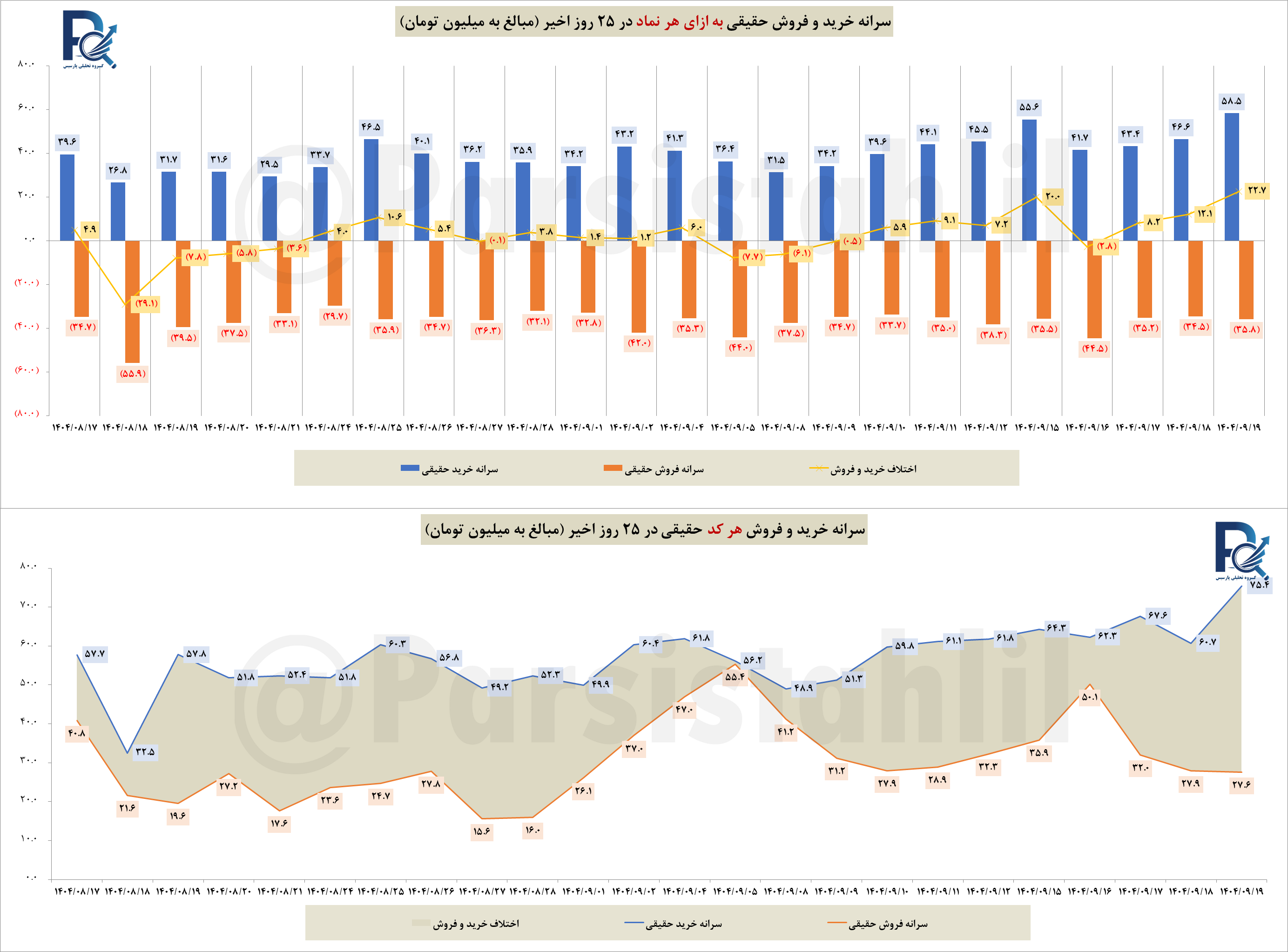 📊دربازار امروز 19 آذر 1404 سرانه خرید هر نماد در بازار ، در حدود 58.5 میلیون تومان و سرانه فروش در حدود 35.8 میلیون تومان بود.
