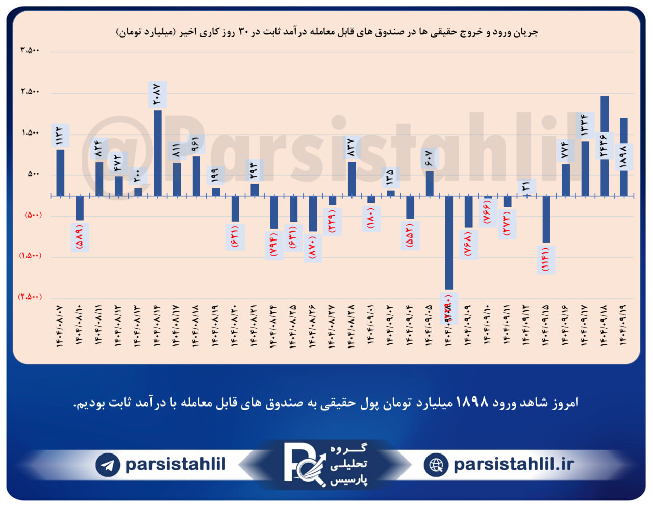 📊 امروز شاهد ورود 1898 میلیارد تومان پول حقیقی به صندوق های قابل معامله با درآمد ثابت بودیم.