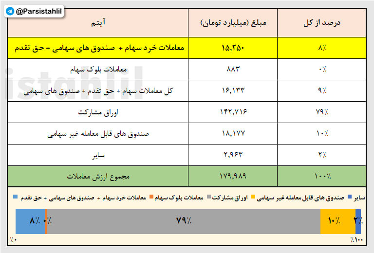 همانطور که در جدول فوق مشاهده می نمایید ارزش کل معاملات امروز بازار 179,989 میلیارد تومان بوده که از این مبلغ 15,250 میلیارد تومان آن مربوط به معاملات خرد سهام و حق تقدم و صندوق های سهامی بوده است.