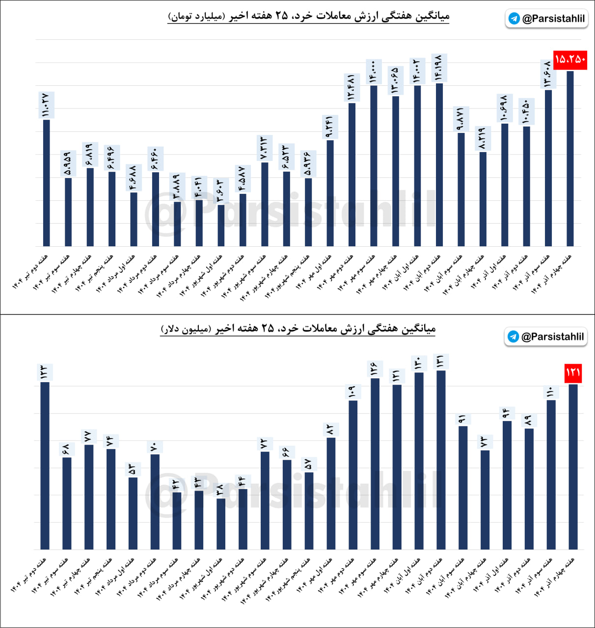 میانگین هفتگی معاملات خرد (ارزش معاملات دلاری) هفته چهارم آذر 1404 به 121 میلیون دلار رسید.
