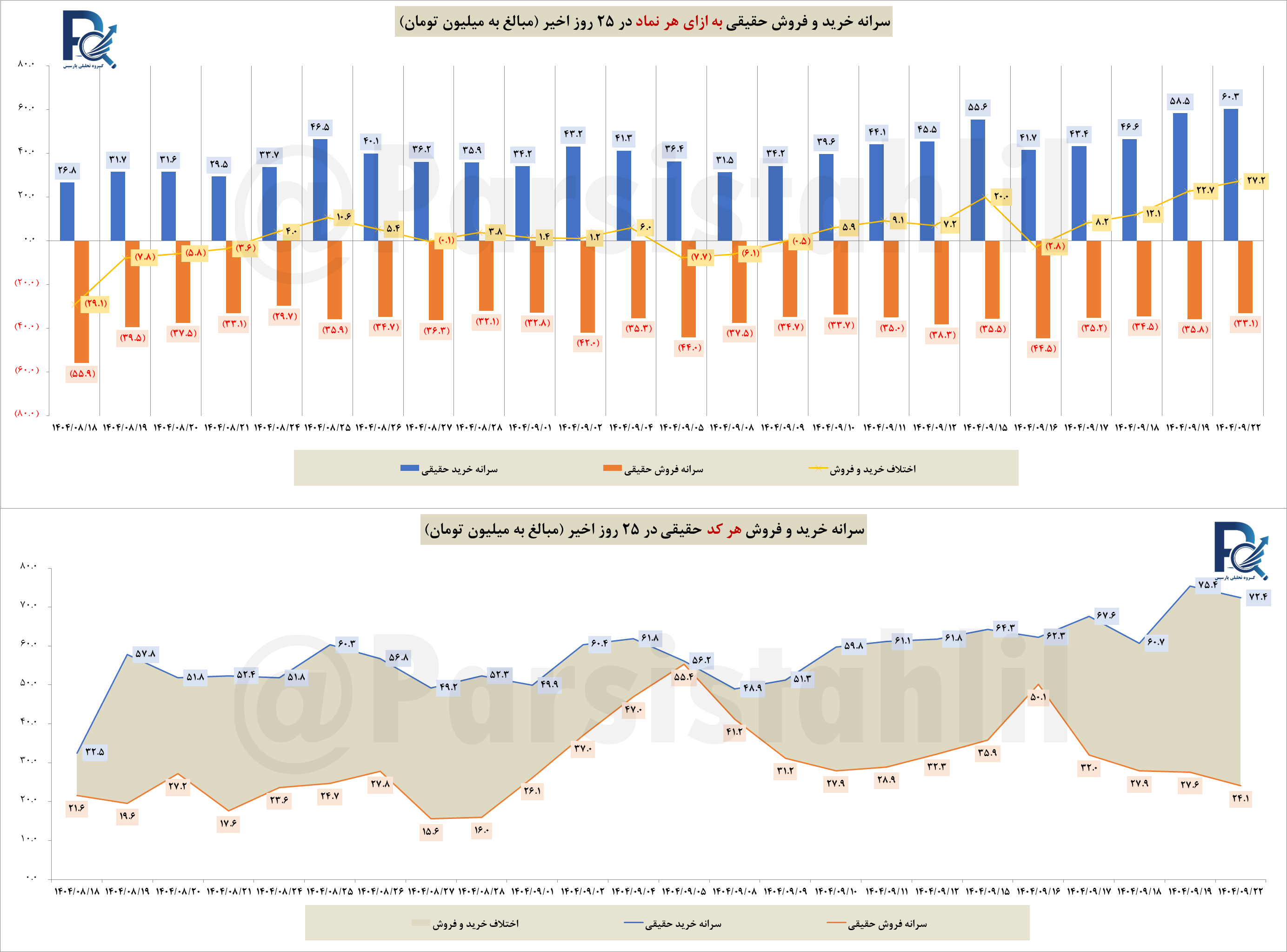 📊دربازار امروز 22 آذر 1404 سرانه خرید هر نماد در بازار ، در حدود 60.3 میلیون تومان و سرانه فروش در حدود 33.1 میلیون تومان بود.