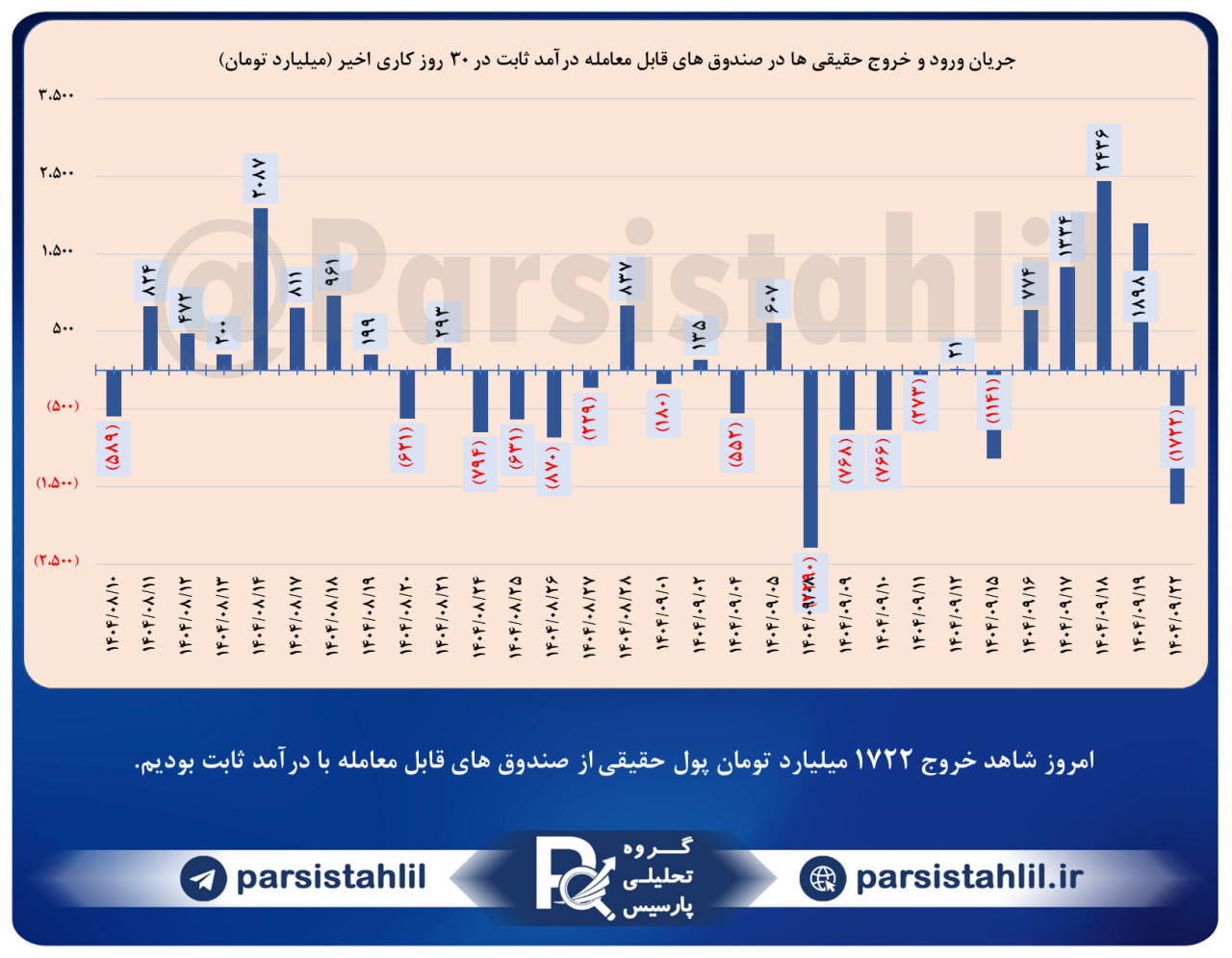 📊 امروز شاهد خروج 1722 میلیارد تومان پول حقیقی از صندوق های قابل معامله با درآمد ثابت بودیم.