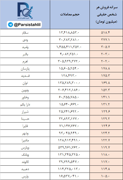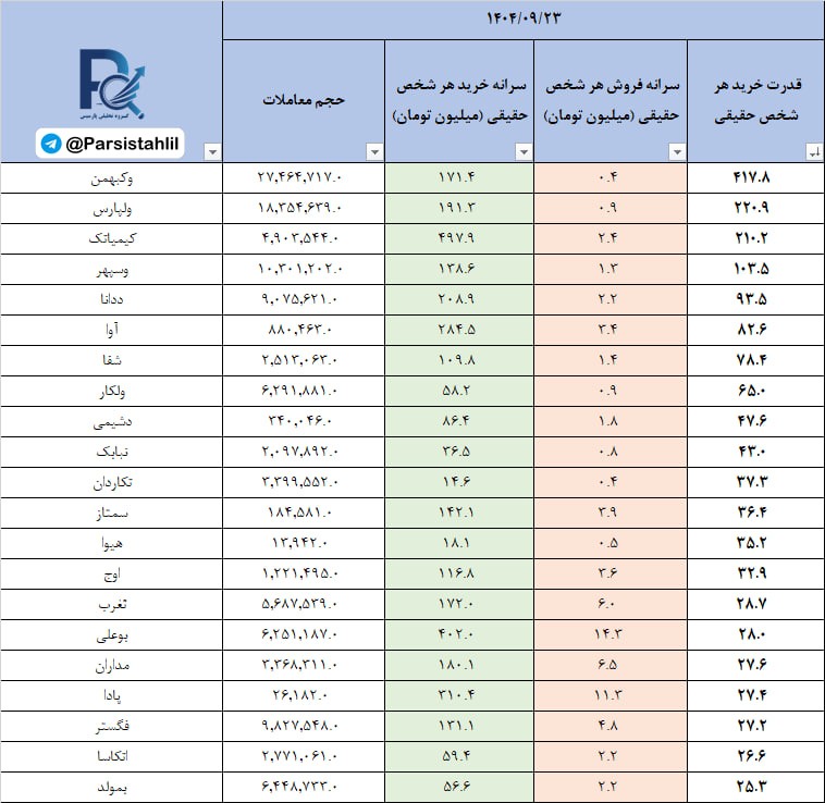 در جدول فوق نمادهایی که بالاترین نسبت سرانه خرید به سرانه فروش مشتریان حقیقی (قدرت خریدار حقیقی) در بازار امروز داشته اند قابل مشاهده است.