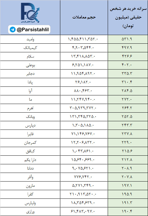 15 نماد با بالاترین سرانه خرید و فروش حقیقی