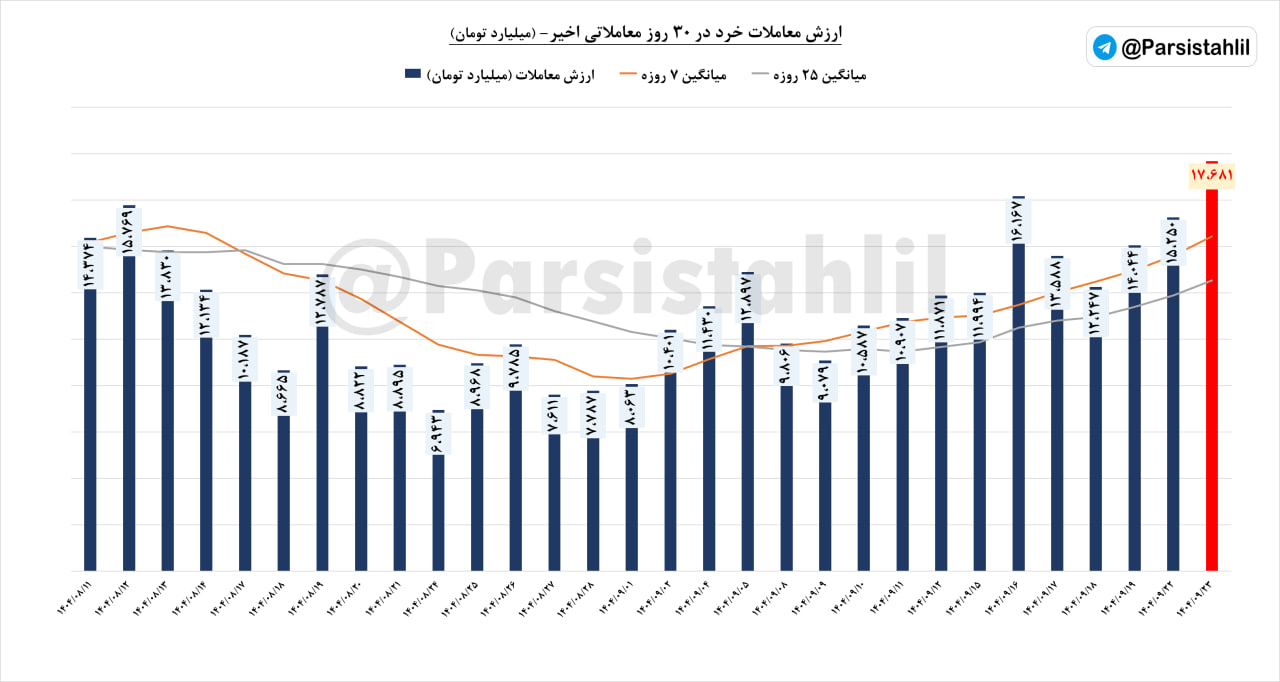 📊ارزش معاملات #خرد (سهام+حق تقدم+صندوق های سهامی) امروز بازار مورخ 23 آذر 1404 مبلغ 17681 میلیارد تومان بود.