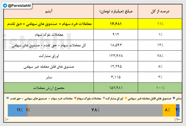 همانطور که در جدول فوق مشاهده می نمایید ارزش کل معاملات امروز بازار 157,981 میلیارد تومان بوده که از این مبلغ 17,681 میلیارد تومان آن مربوط به معاملات خرد سهام و حق تقدم و صندوق های سهامی بوده است.