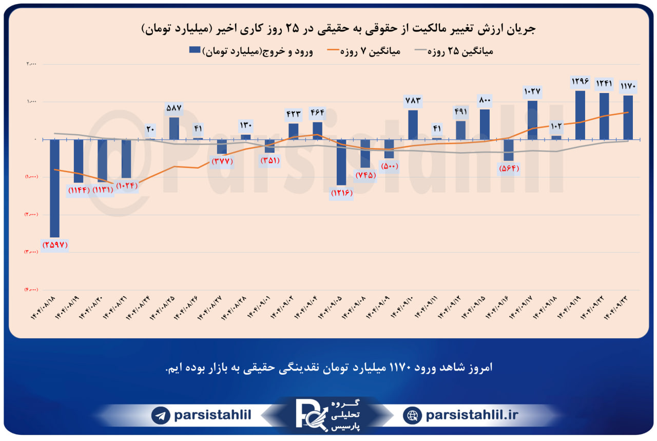 در بازار امروز 1404/09/23 مجموعا مبلغ 1170 میلیارد تومان ورود حقیقی به بازار داشته ایم. (سهام + حق تقدم + صندوق های قابل معامله سهامی)
