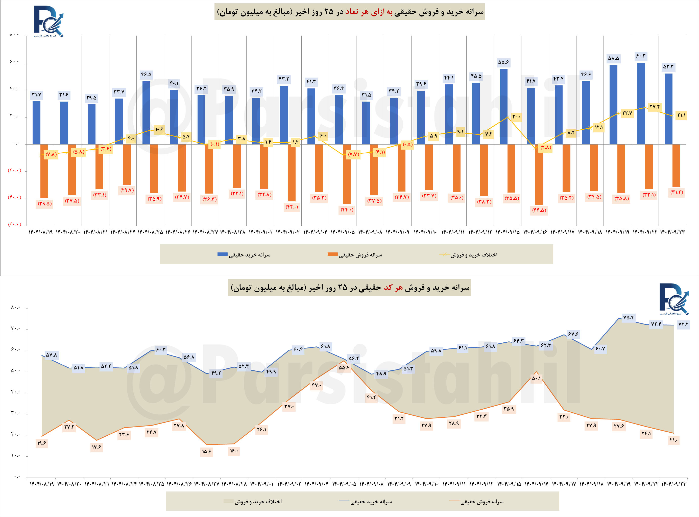 📊دربازار امروز 23 آذر 1404 سرانه خرید هر نماد در بازار ، در حدود 52.3 میلیون تومان و سرانه فروش در حدود 31.2 میلیون تومان بود.