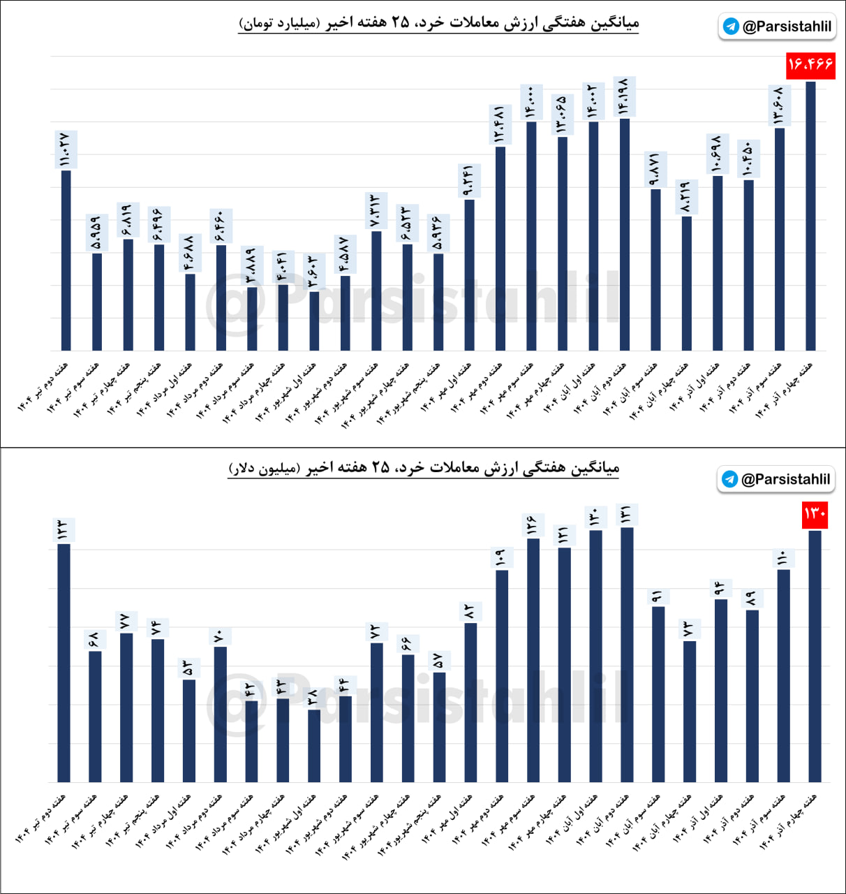 میانگین هفتگی معاملات خرد (ارزش معاملات دلاری) هفته چهارم آذر 1404 به 130 میلیون دلار رسید.