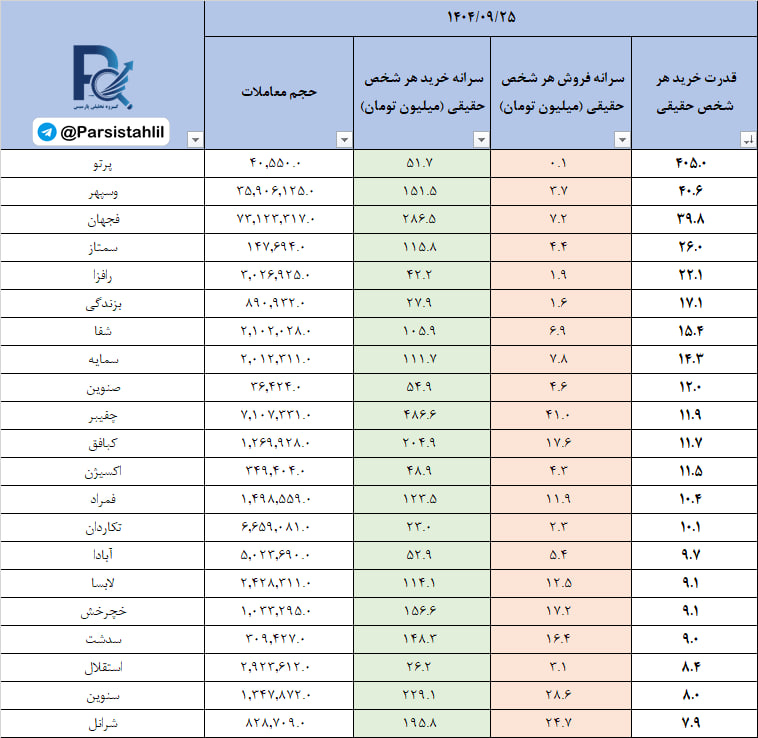 در جدول فوق نمادهایی که بالاترین نسبت سرانه خرید به سرانه فروش مشتریان حقیقی (قدرت خریدار حقیقی) در بازار امروز داشته اند قابل مشاهده است.