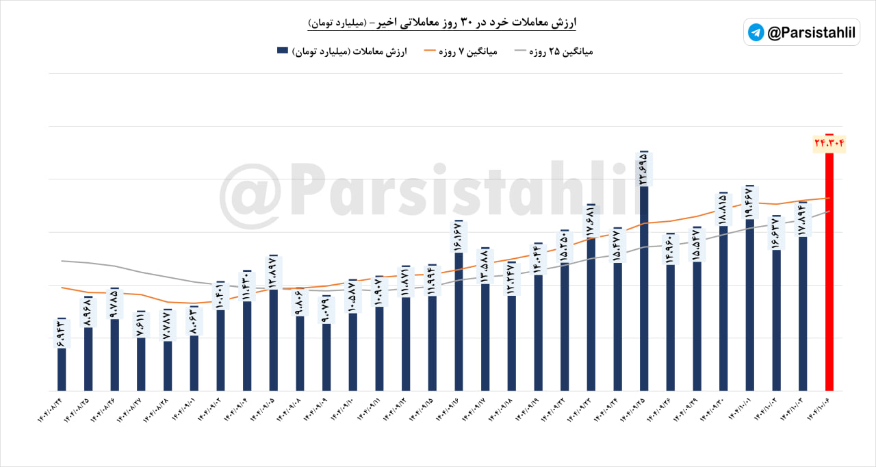 📊میانگین هفتگی معاملات خرد (ارزش معاملات ریالی) هفته دوم دی 1404 به 24304 میلیارد تومان رسید.