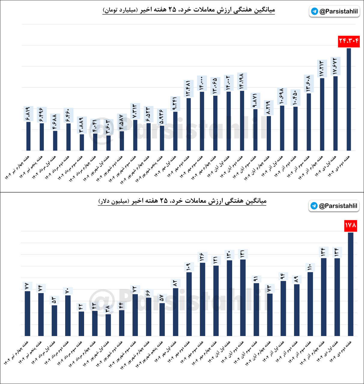 میانگین هفتگی معاملات خرد (ارزش معاملات دلاری) هفته دوم دی 1404 به 178 میلیون دلار رسید.