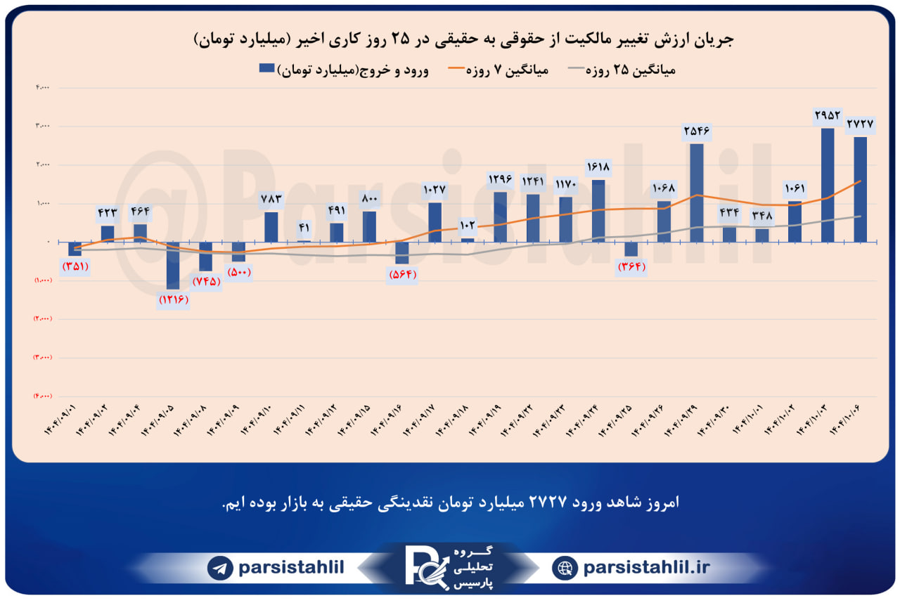 در بازار امروز 1404/10/06 مجموعا مبلغ 2727 میلیارد تومان ورود حقیقی به بازار داشته ایم. (سهام + حق تقدم + صندوق های قابل معامله سهامی)
