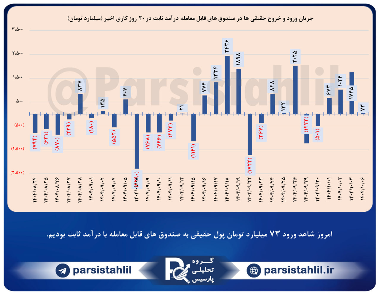 📊 امروز شاهد ورود 73 میلیارد تومان پول حقیقی به صندوق های قابل معامله با درآمد ثابت بودیم.