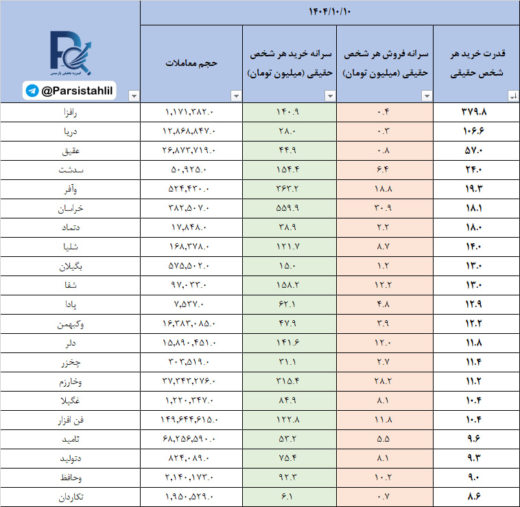 در جدول فوق نمادهایی که بالاترین نسبت سرانه خرید به سرانه فروش مشتریان حقیقی (قدرت خریدار حقیقی) در بازار امروز داشته اند قابل مشاهده است.