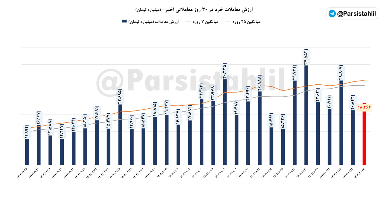 📊میانگین هفتگی معاملات خرد (ارزش معاملات ریالی) هفته پنجم دی 1404 به 18462 میلیارد تومان رسید.