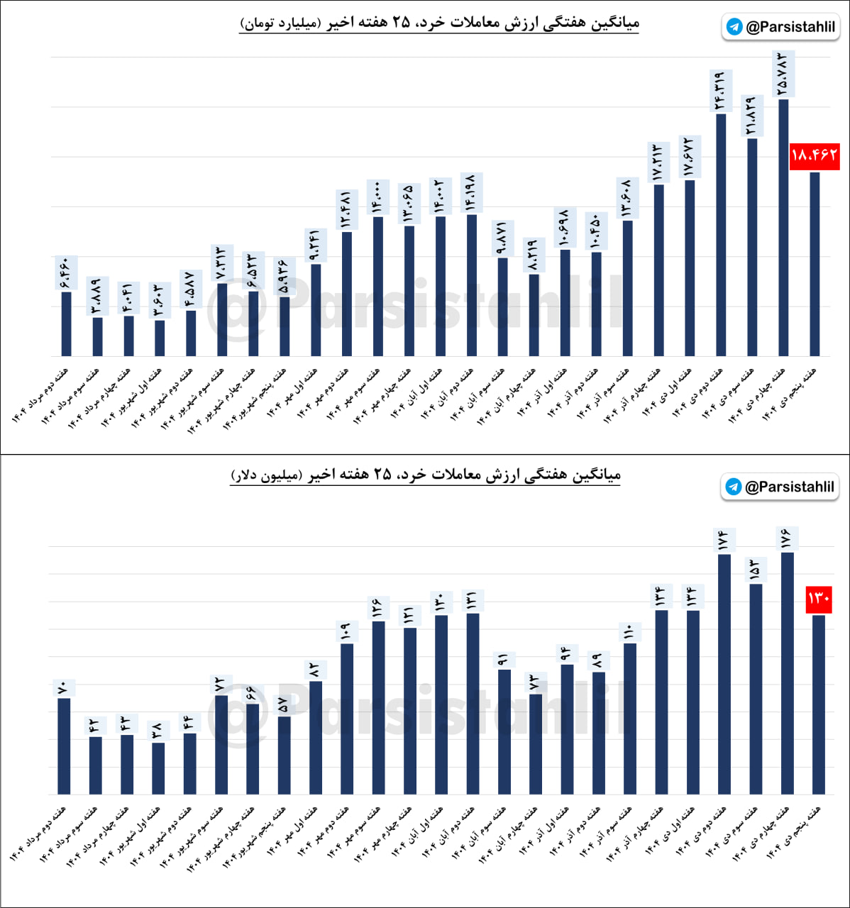 میانگین هفتگی معاملات خرد (ارزش معاملات دلاری) هفته پنجم دی 1404 به 130 میلیون دلار رسید.