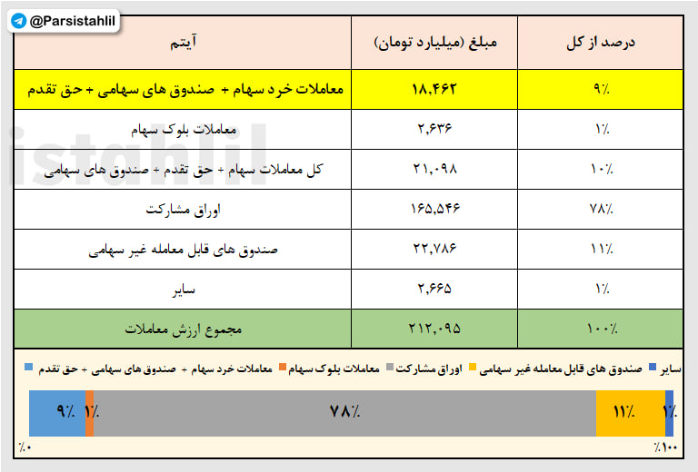 همانطور که در جدول فوق مشاهده می نمایید ارزش کل معاملات امروز بازار 212,095 میلیارد تومان بوده که از این مبلغ 18,462 میلیارد تومان آن مربوط به معاملات خرد سهام و حق تقدم و صندوق های سهامی بوده است.