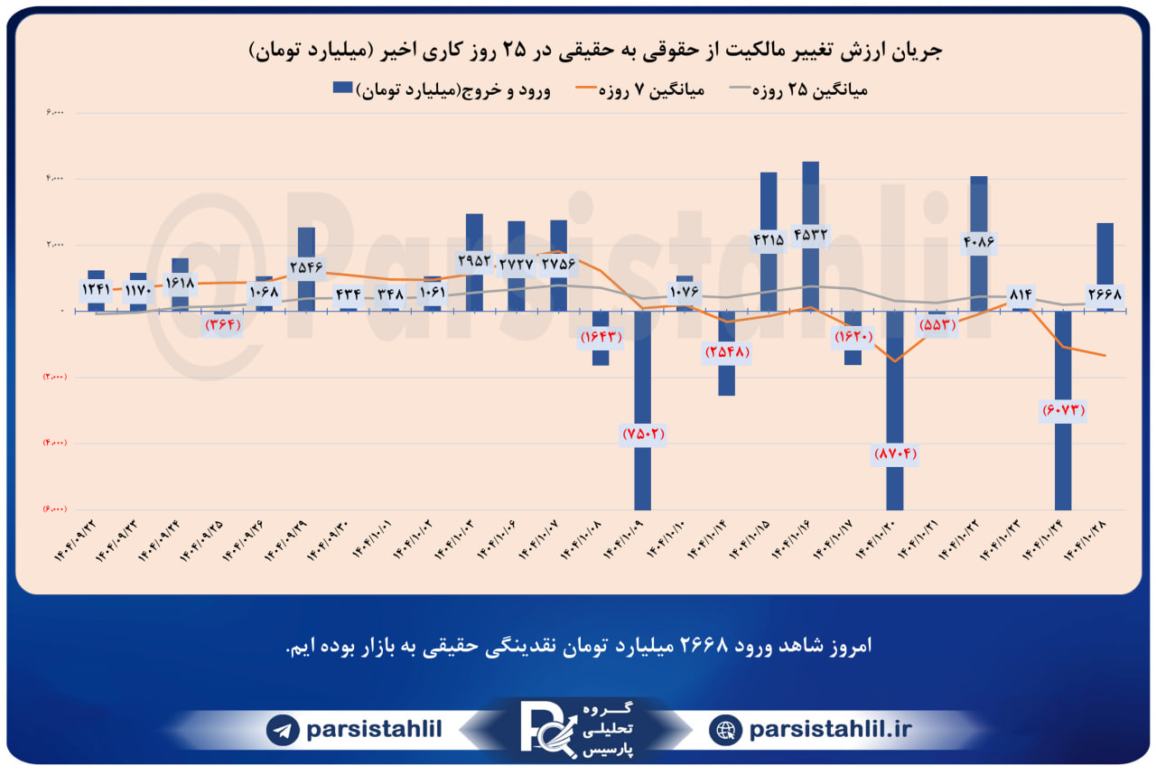 در بازار امروز 1404/10/28 مجموعا مبلغ 2668 میلیارد تومان ورود حقیقی به بازار داشته ایم. (سهام + حق تقدم + صندوق های قابل معامله سهامی)
