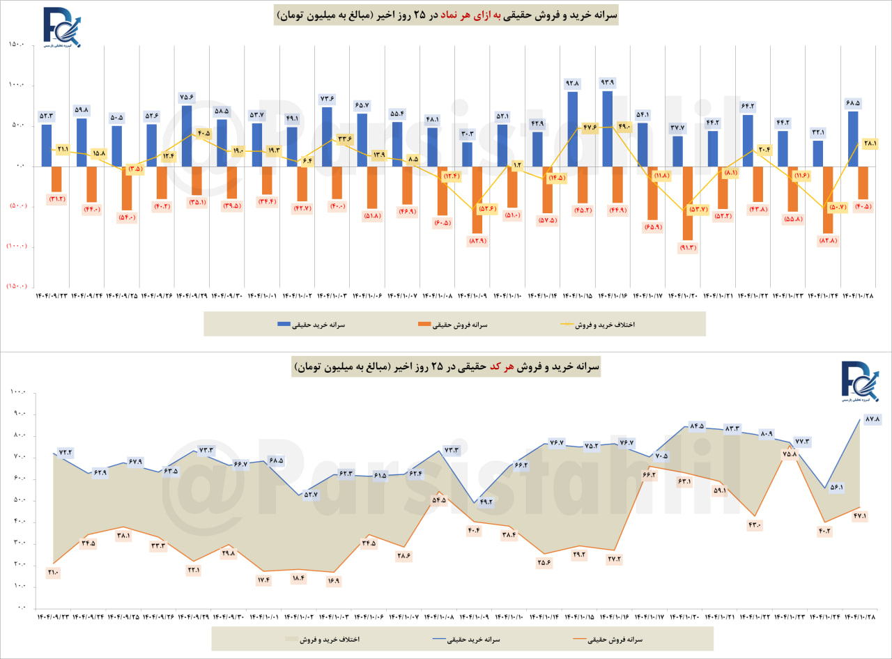 📊دربازار امروز 28 دی 1404 سرانه خرید هر نماد در بازار ، در حدود 68.5 میلیون تومان و سرانه فروش در حدود 40.5 میلیون تومان بود.