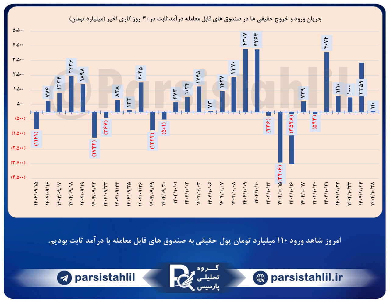 📊 امروز شاهد ورود 110 میلیارد تومان پول حقیقی به صندوق های قابل معامله با درآمد ثابت بودیم.