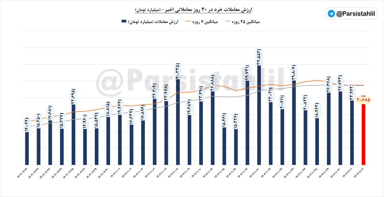 📊میانگین هفتگی معاملات خرد (ارزش معاملات ریالی) هفته اول بهمن 1404 به 20685 میلیارد تومان رسید.