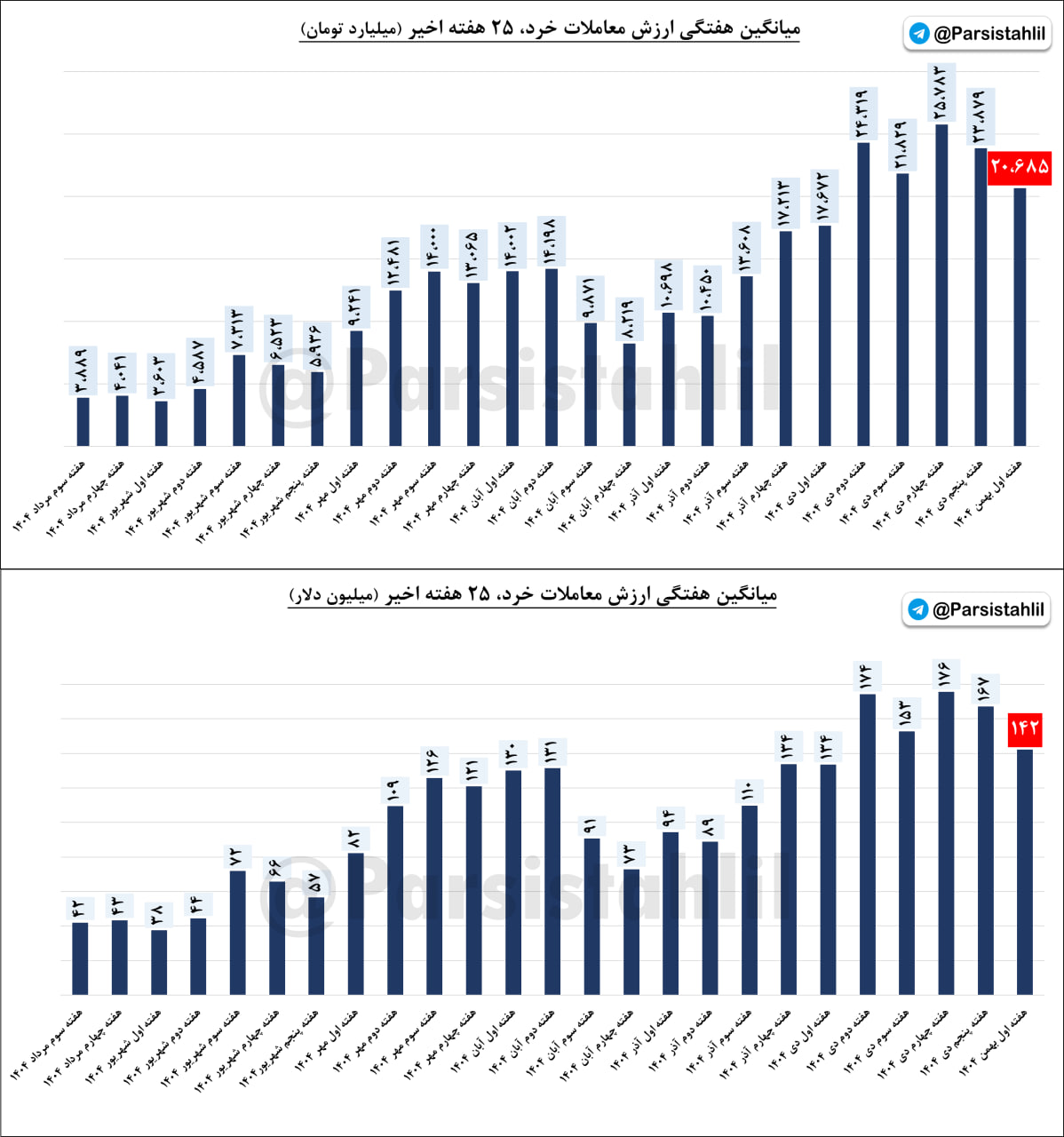میانگین هفتگی معاملات خرد (ارزش معاملات دلاری) هفته اول بهمن 1404 به 142 میلیون دلار رسید.