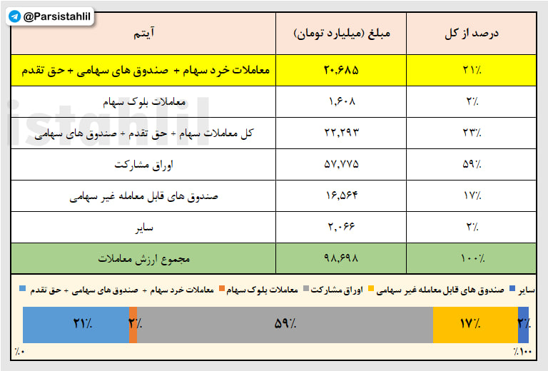همانطور که در جدول فوق مشاهده می نمایید ارزش کل معاملات امروز بازار 98,698 میلیارد تومان بوده که از این مبلغ 20,685 میلیارد تومان آن مربوط به معاملات خرد سهام و حق تقدم و صندوق های سهامی بوده است.