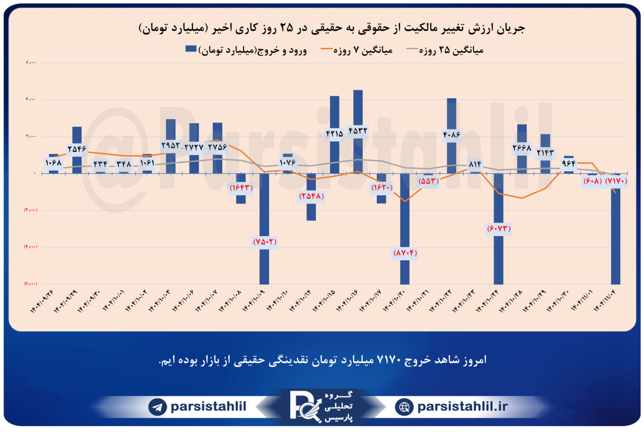 در بازار امروز 1404/11/04 مجموعا مبلغ 7170 میلیارد تومان خروج حقیقی از بازار داشته ایم. (سهام + حق تقدم + صندوق های قابل معامله سهامی)