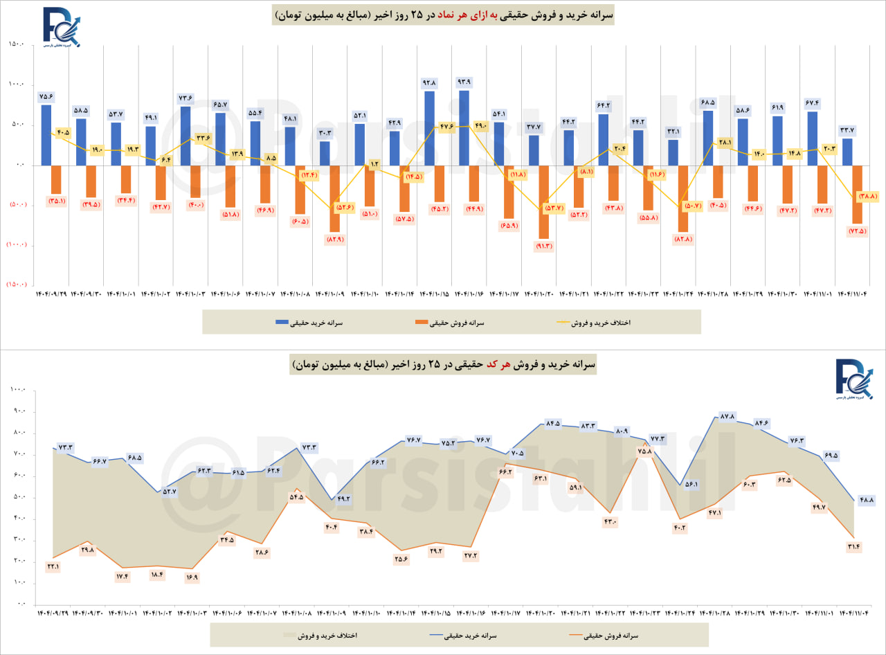 📊دربازار امروز 4 بهمن 1404 سرانه خرید هر نماد در بازار ، در حدود 33.7 میلیون تومان و سرانه فروش در حدود 72.5 میلیون تومان بود.