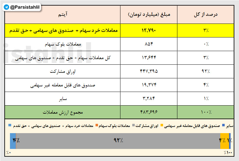 همانطور که در جدول فوق مشاهده می نمایید ارزش کل معاملات امروز بازار 483,696 میلیارد تومان بوده که از این مبلغ 12,790 میلیارد تومان آن مربوط به معاملات خرد سهام و حق تقدم و صندوق های سهامی بوده است.