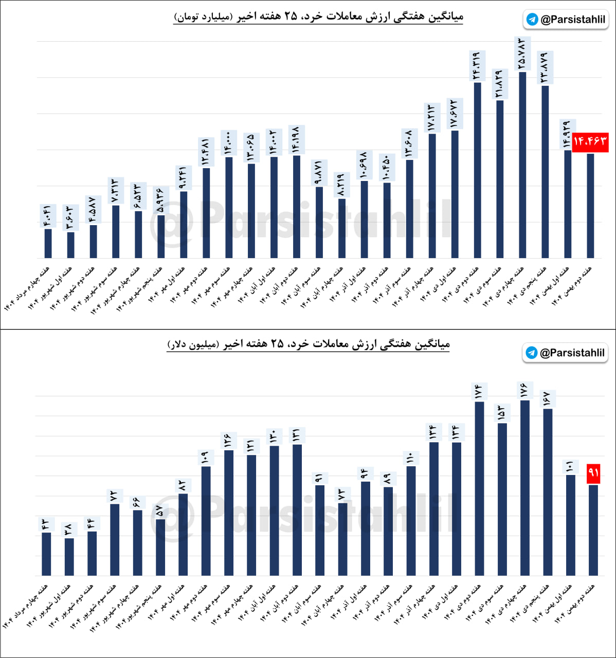 میانگین هفتگی معاملات خرد (ارزش معاملات دلاری) هفته دوم بهمن 1404 به 91 میلیون دلار رسید.