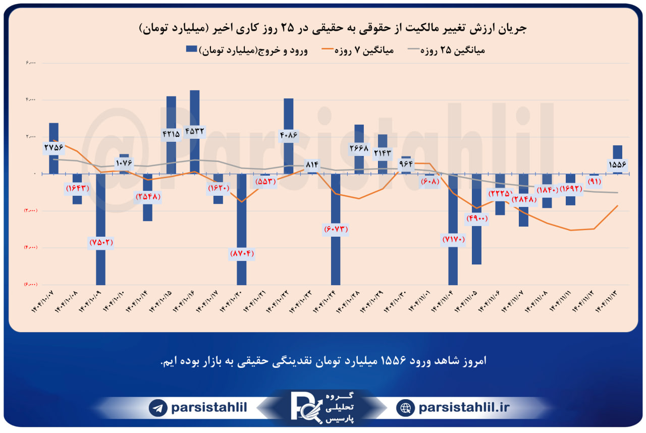 در بازار امروز 1404/11/13 مجموعا مبلغ 1556 میلیارد تومان ورود حقیقی به بازار داشته ایم. (سهام + حق تقدم + صندوق های قابل معامله سهامی)
