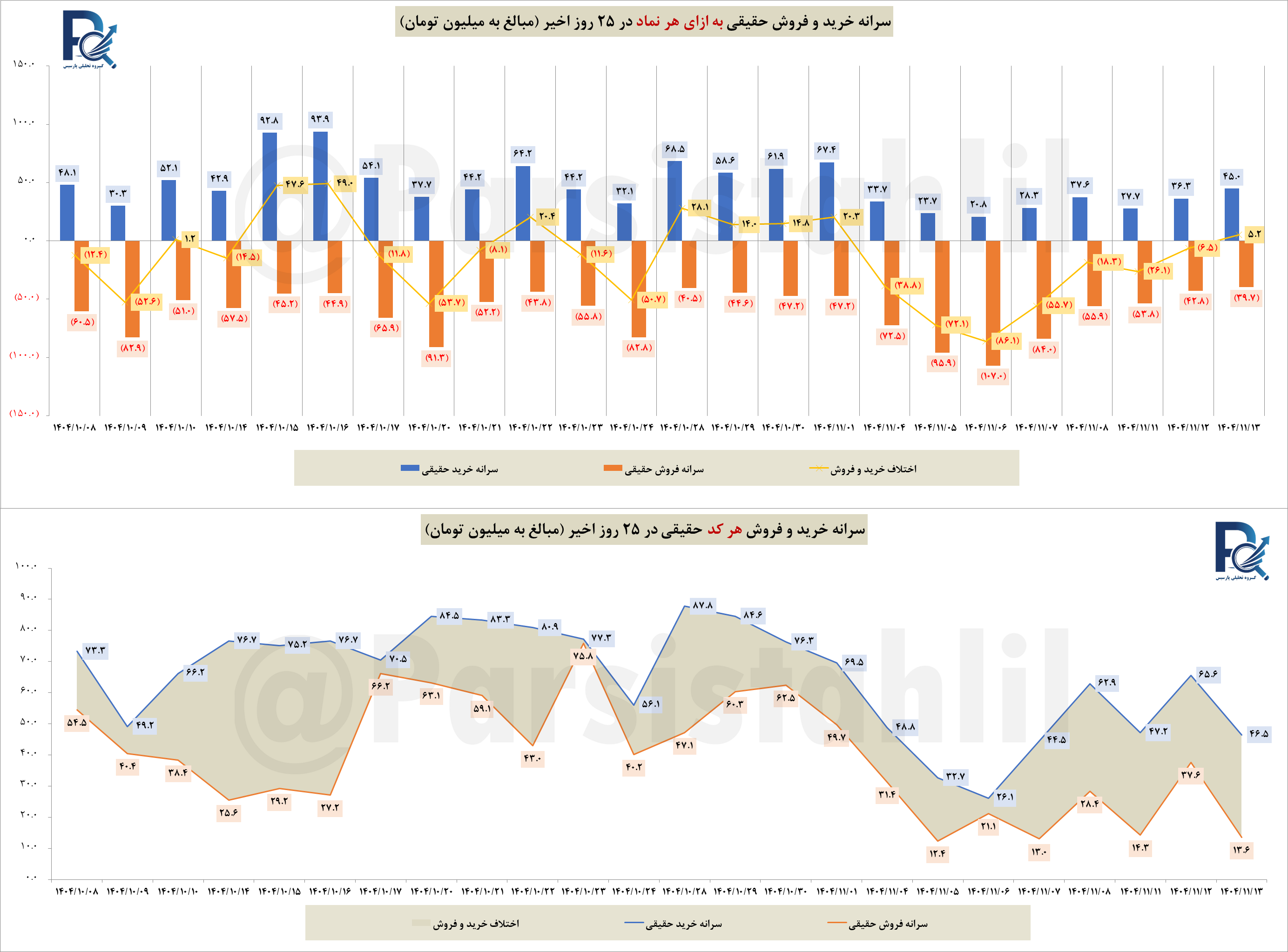 📊دربازار امروز 13 بهمن 1404 سرانه خرید هر نماد در بازار ، در حدود 45 میلیون تومان و سرانه فروش در حدود 39.7 میلیون تومان بود.