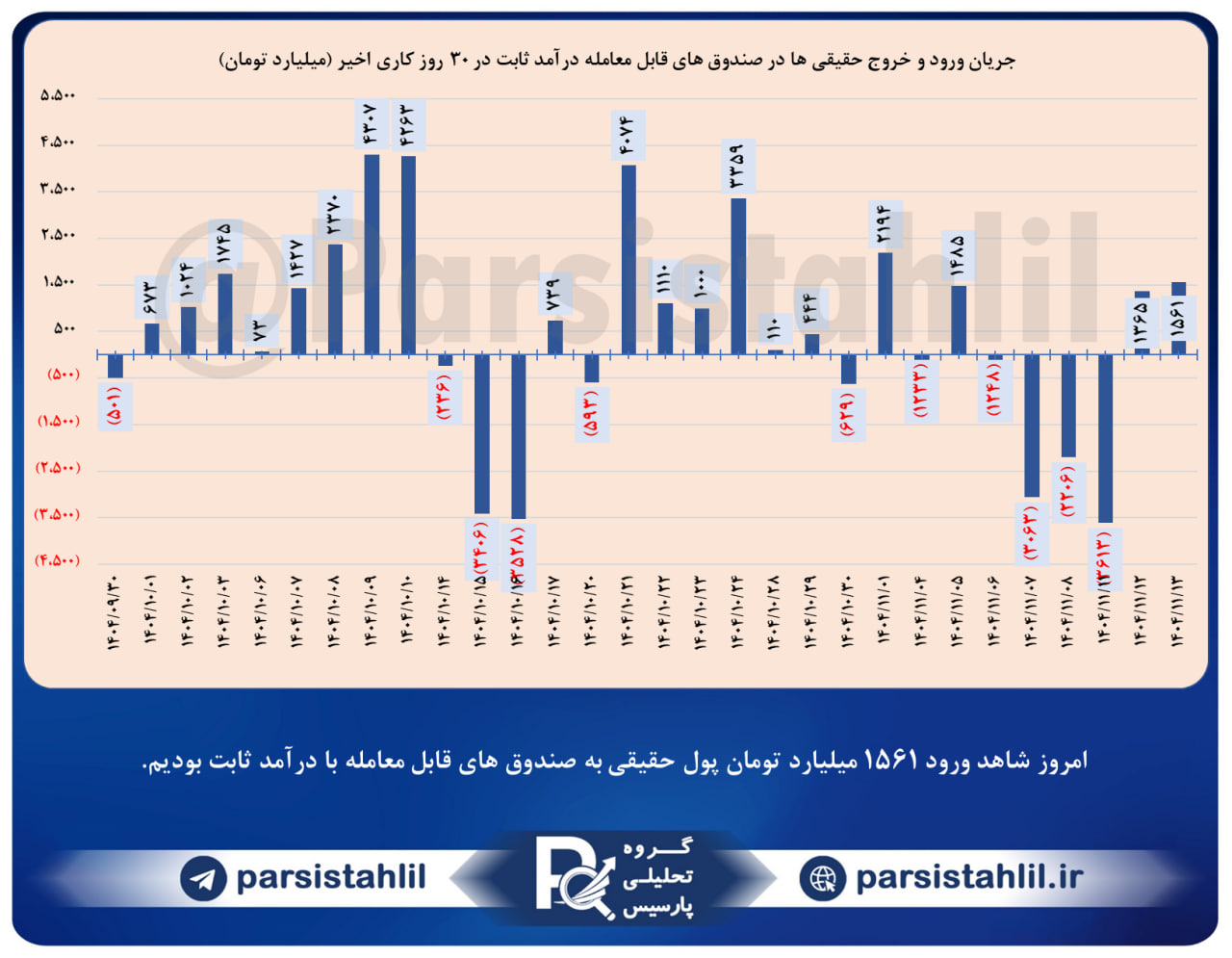 📊 امروز شاهد ورود 1561 میلیارد تومان پول حقیقی به صندوق های قابل معامله با درآمد ثابت بودیم.