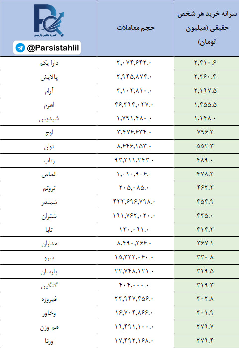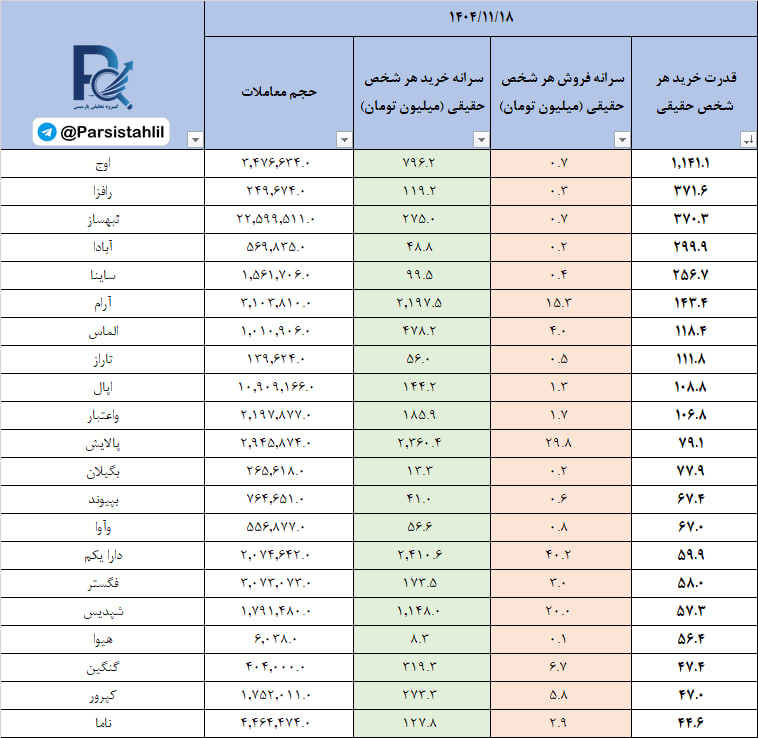 در جدول فوق نمادهایی که بالاترین نسبت سرانه خرید به سرانه فروش مشتریان حقیقی (قدرت خریدار حقیقی) در بازار امروز داشته اند قابل مشاهده است.