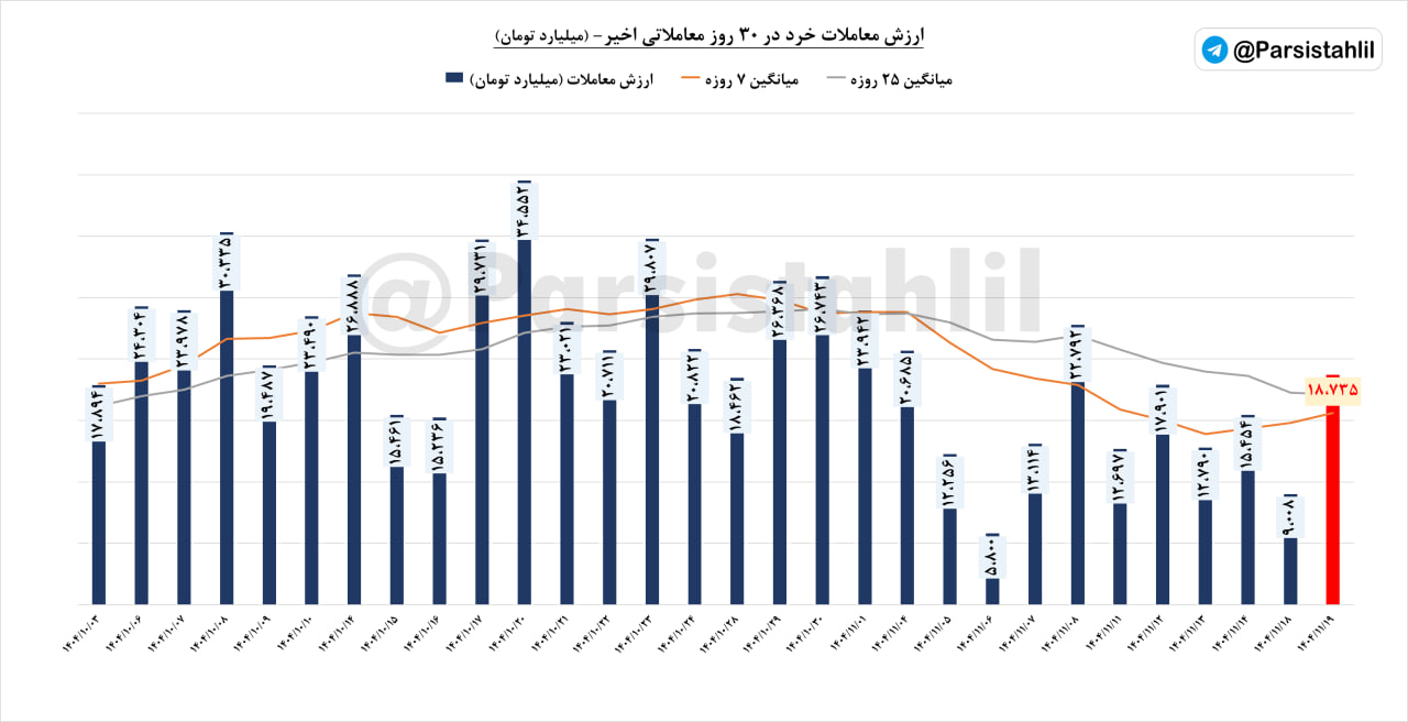 امروز 13 درصد از کل ارزش معاملات مربوط به معاملات خرد بود.