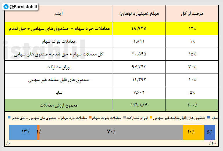 همانطور که در جدول فوق مشاهده می نمایید ارزش کل معاملات امروز بازار 139,884 میلیارد تومان بوده که از این مبلغ 18,735 میلیارد تومان آن مربوط به معاملات خرد سهام و حق تقدم و صندوق های سهامی بوده است.