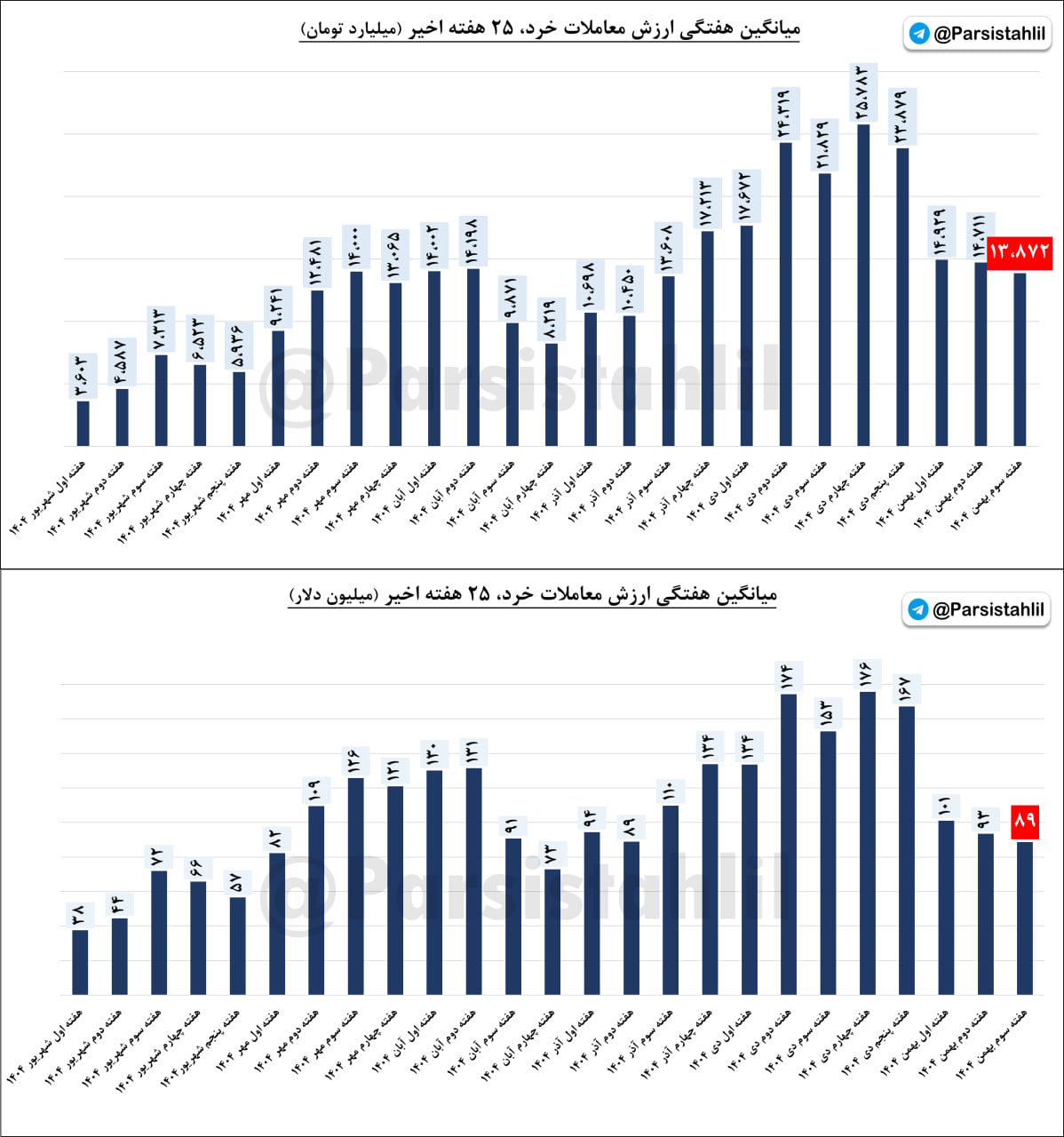 میانگین هفتگی معاملات خرد (ارزش معاملات دلاری) هفته سوم بهمن 1404 به 89 میلیون دلار رسید.