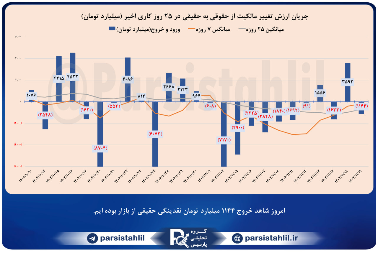 در بازار امروز 1404/11/19 مجموعا مبلغ 1144 میلیارد تومان خروج حقیقی از بازار داشته ایم. (سهام + حق تقدم + صندوق های قابل معامله سهامی)