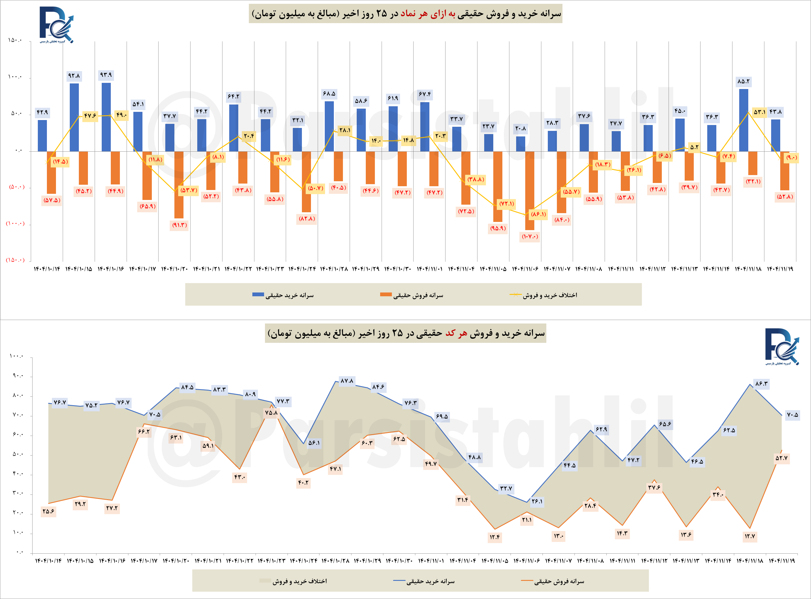 همچنین، در بازار امروز به ازای هر کد (میانگین نمادها) ، سرانه خرید حقیقی در حدود 70.5 میلیون تومان و سرانه فروش در حدود 52.7 میلیون تومان بود.