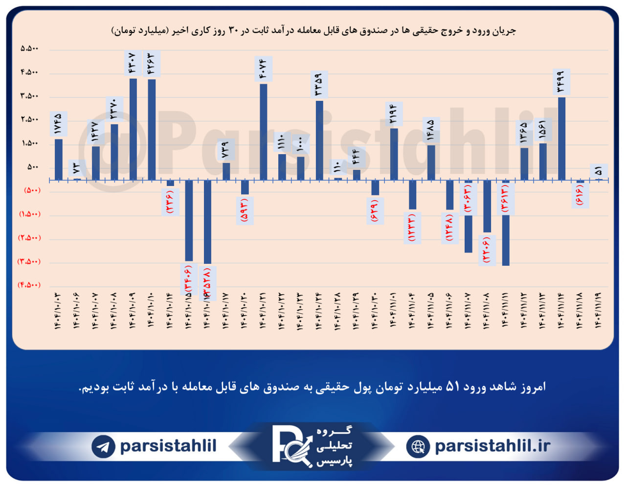 📊 امروز شاهد ورود 51 میلیارد تومان پول حقیقی به صندوق های قابل معامله با درآمد ثابت بودیم.