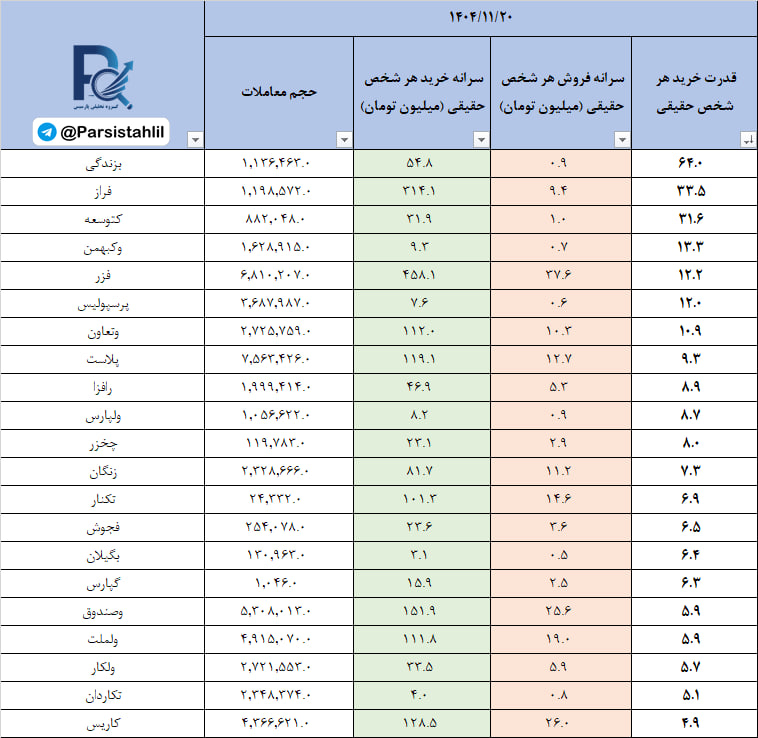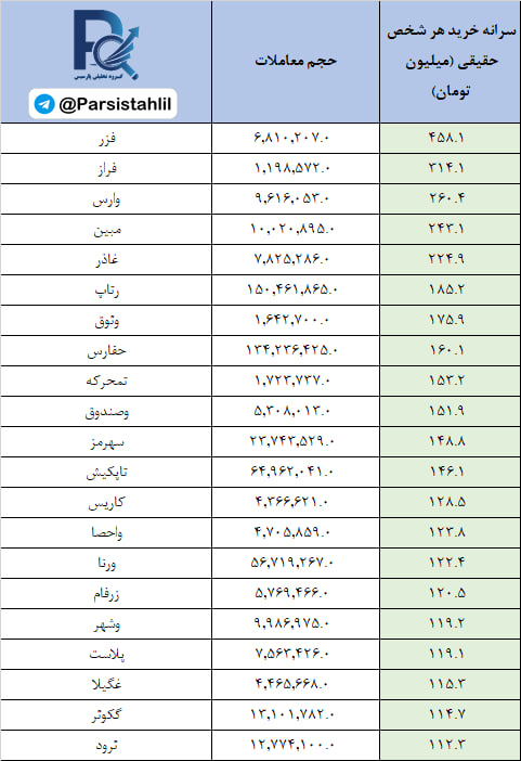در جدول فوق نمادهایی که بالاترین نسبت سرانه خرید به سرانه فروش مشتریان حقیقی (قدرت خریدار حقیقی) در بازار امروز داشته اند قابل مشاهده است.