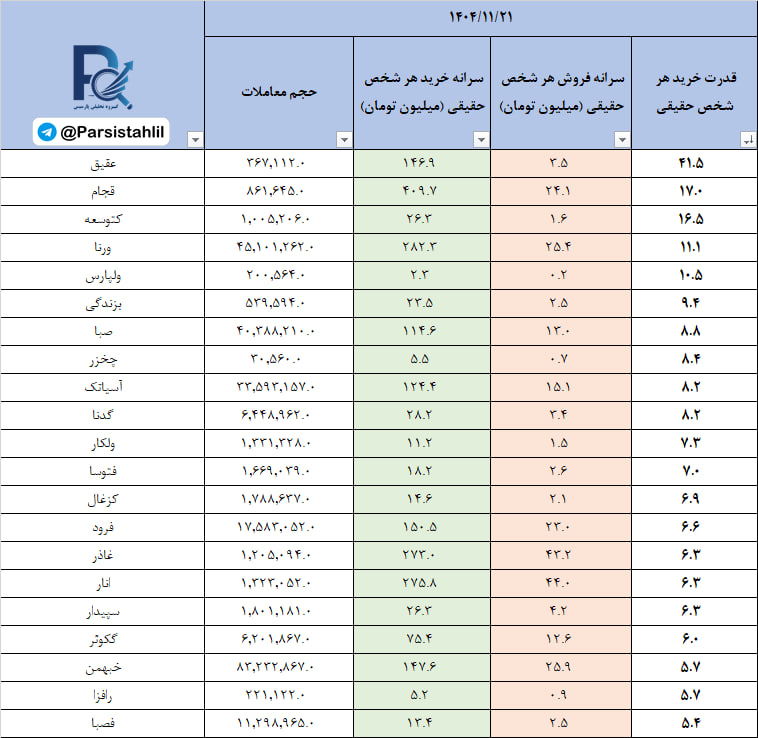 در جدول فوق نمادهایی که بالاترین نسبت سرانه خرید به سرانه فروش مشتریان حقیقی (قدرت خریدار حقیقی) در بازار امروز داشته اند قابل مشاهده است.
