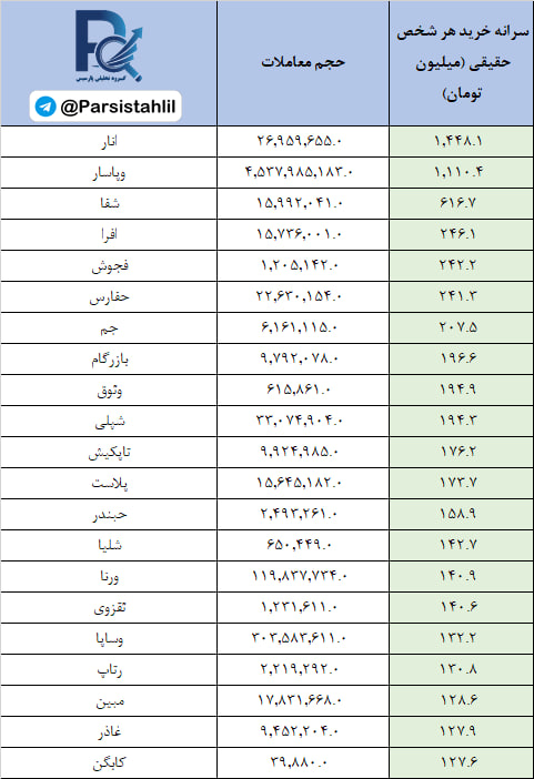 در جدول فوق نمادهایی که بالاترین نسبت سرانه خرید به سرانه فروش مشتریان حقیقی (قدرت خریدار حقیقی) در بازار امروز داشته اند قابل مشاهده است.