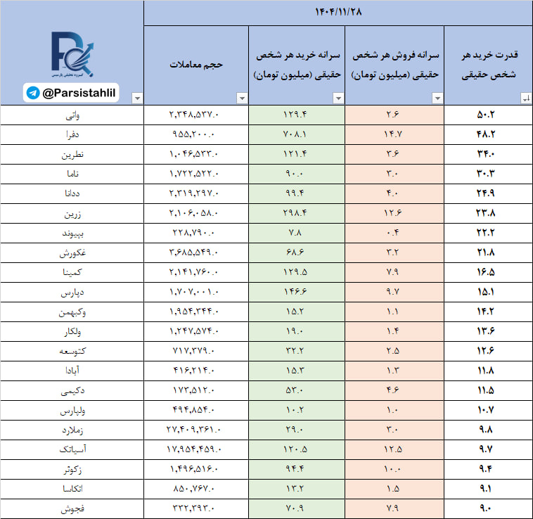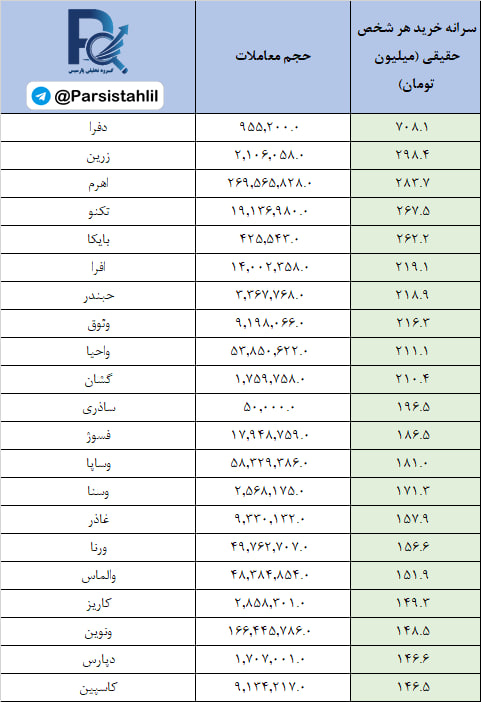 در جدول فوق نمادهایی که بالاترین نسبت سرانه خرید به سرانه فروش مشتریان حقیقی (قدرت خریدار حقیقی) در بازار امروز داشته اند قابل مشاهده است.