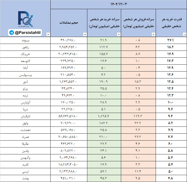 در جدول فوق نمادهایی که بالاترین نسبت سرانه خرید به سرانه فروش مشتریان حقیقی (قدرت خریدار حقیقی) در بازار امروز داشته اند قابل مشاهده است.