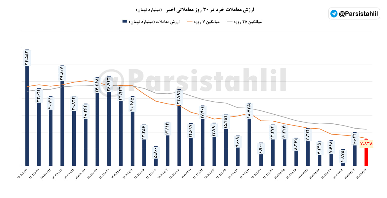 📊ارزش معاملات #خرد (سهام+حق تقدم+صندوق های سهامی) امروز بازار مورخ 4 اسفند 1404 مبلغ 7838 میلیارد تومان بود.